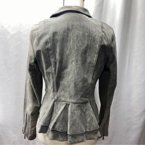 Stylish gray 100% suede jacket with asymmetrical zipper. Perfect for a modern look. Layered gathering on lower back.