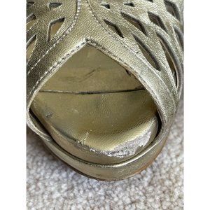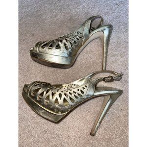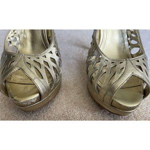 BCBGeneration Women's Heels 8.5B Gold 4" Platform Laser Cut Open Toe Sling Back