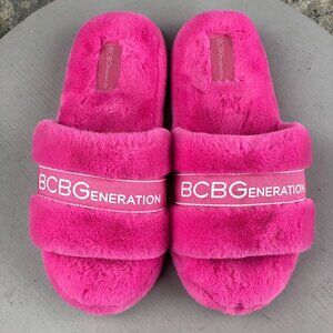 BCBGeneration Women's Medium 7-8 Pink Faux Fur Logo Open Toe Slides Slippers