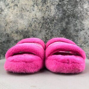 Women's hot pink plush faux fur logo open toe slides, sandals, slippers, house shoes.