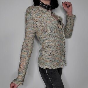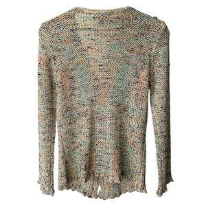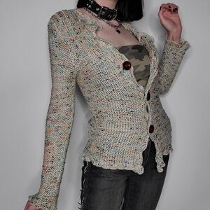 BCBGeneration | Women’s cream confetti 3-button cardigan sweater. Open knit, scalloped hems, wooden buttons. Hand wash cold, 70% acrylic, 30% nylon. Women’s size M