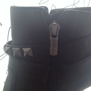 Black leather booties with studs. Very trendy and adds a little bit of toughness to any outfit. It has a hidden platform to make them more comfortable. I wore them twice and absolutely love them but just can't bring myself to wear them out. I live in Boston and most bars have a pathway of bricks you have to make it through and unfortunately I'm not that coordinated.