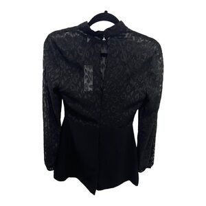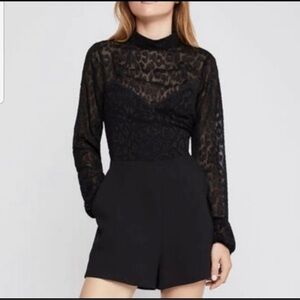 Sexy BCBGeneration black leopard print romper. Zips mid- back and clasps at neck with keyhole opening. NWT. Perfect for holiday gathering or any special occasion. Semi sheer