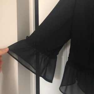 Worn only once as a cover-up to a colder-than-expected cocktail party, this open jacket has chiffon cuffs and trim. It’s in basically new condition and is perfect as a cover-up for a sleeveless dress or jumpsuit.