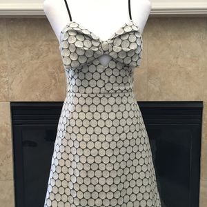 Darling black & white polka dot dress from BCBGeneration. I believe this to be a sample, as there is no size label, material content or care instructions. Per measurements, dress would best flatter a size 1-3. Fully lined with a hidden side zipper closure, front pockets, cutout bodice and adjustable spaghetti straps.