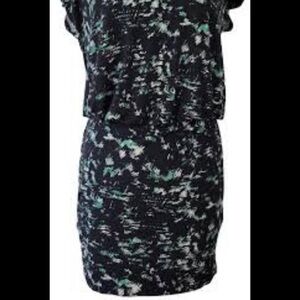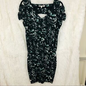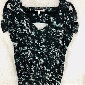 BCBGeneration black with teal and white pattern multicolor keyhole v neck midi dress womens size Small. Stretchy comfortable material. In excellent condition.