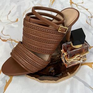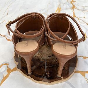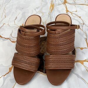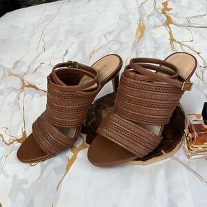 BCBGeneration brown, weave ankle strap up heels excellent condition no damage features a heel height of 3 1/2 inches