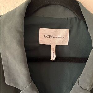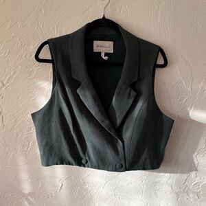This BCBGeneration crop vest features a striking green color, designed with a notched collar for a sophisticated touch. Its fitted silhouette and cropped length make it a chic choice for layering or standalone wear. The top's tailored style ensures a polished and contemporary look.