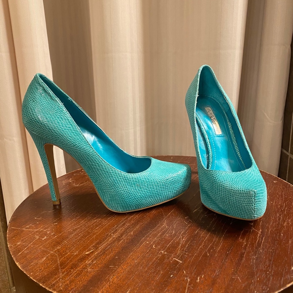 Beautiful teal heels. Snake skin pattern. Gives an outfit that color pop! Only worn twice.