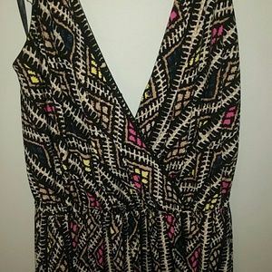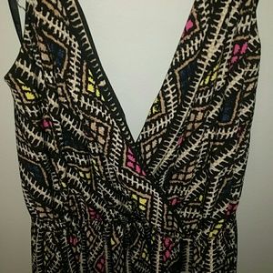 Plunging neckline with a button for optional coverage. Halter straps. Multicolor, mostly brown and black with pops of bright yellow,pink and navy. Worn a couple of times