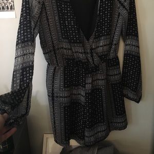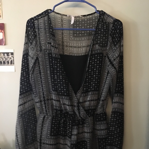 It’s got a lining to cover everything from breast down, but above that is semi sheer, very beautiful. I couldn’t find the fabric tag but my guess is polyester or a thin crepe maybe? I’m short and on me it covers my bottom and then some, but I imagine on a tall person it would be mini style. Looks great with boots.