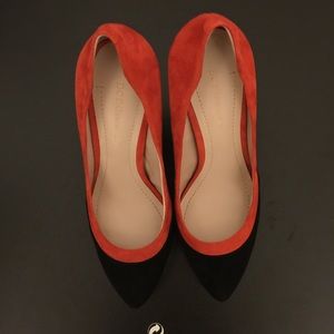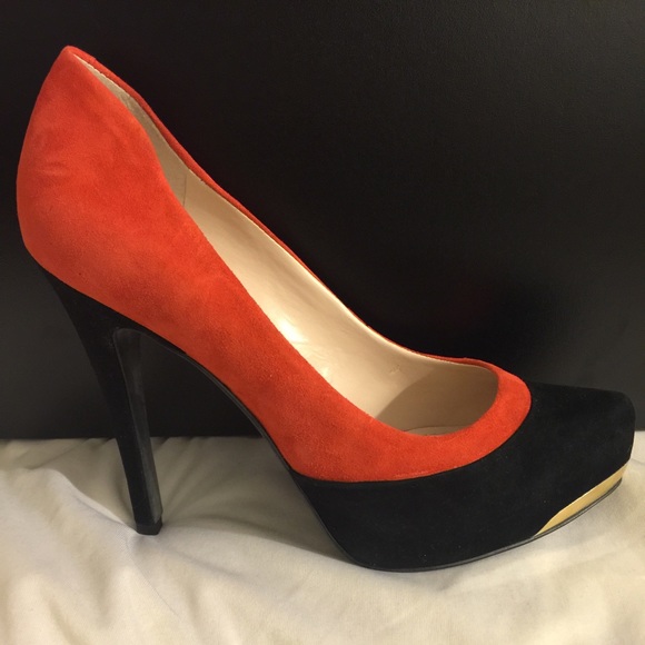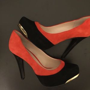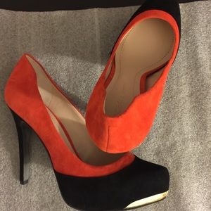 A pair of BCBGeneration platforms in mix of black and orange suede. New in box. Hidden platform 1", heel 4"