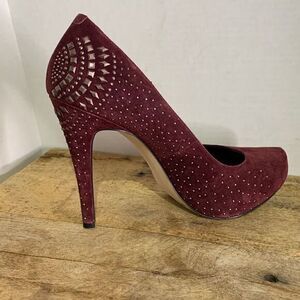 Suede high heels with studded design on back and sides, flaw on inside from removal of a sticker. Worn a few times