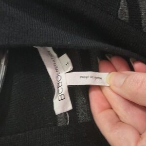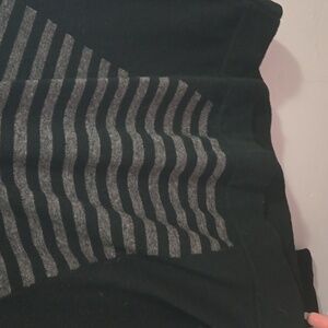 Features: striped sweater with solid black panels on sides and shoulders vee neck long sleeve zipper on back
