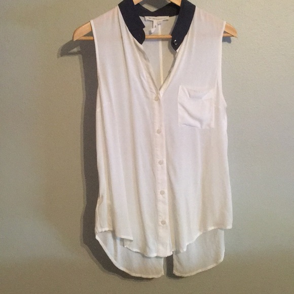 This top has been worn once. It is super light weight and has a slit about halfway up the back. Does have one spot up towards the neckline as pictured.