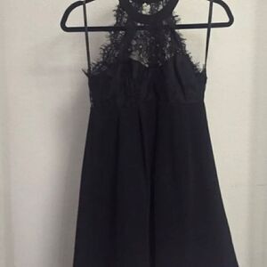 Black halter neck dress with lace detail. 2 button closure at back of neck. Zipper at back. 100% polyester.