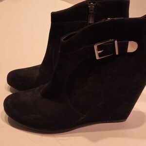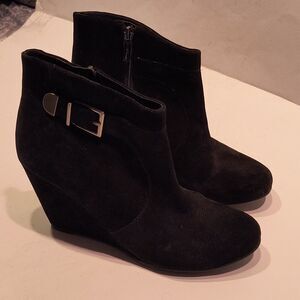 Black Short suede wedge with side zipper boots. Great pre-owned condition.