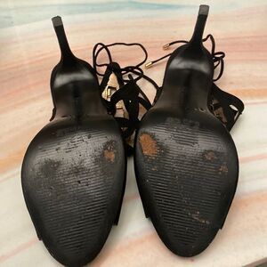 Black lattice stiletto heels. External material feels like suede. Bottom of shoes with wear and tear as shown.