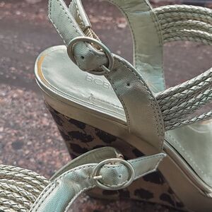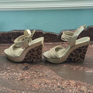 Metallic gold upper with leopard print heel. EUC, smoke free home. Elastic adjustable straps.