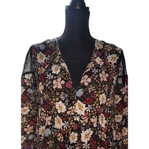 Multicolor floral print peplum chiffon blouse. Tie neck. Long sleeve. Lace shoulder design. Self: 100% polyester. Contrast: 100% nylon. Size: small. Original price: $78.00. NWT.
