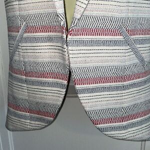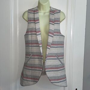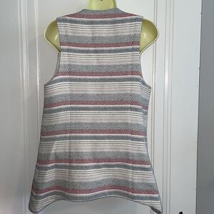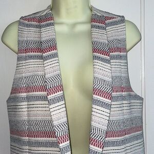 BCBGeneration black,red, cream & gray horizontal striped thick weave polyester/cotton vest with hook & eye enclosure in front