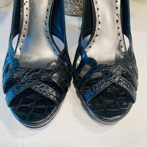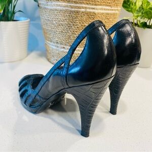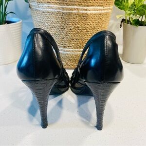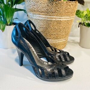 BCBGirls Black Leather Caged Open Top Pump Heels Women’s 9 | 4.5” Heel
