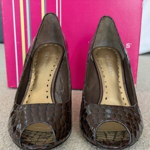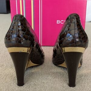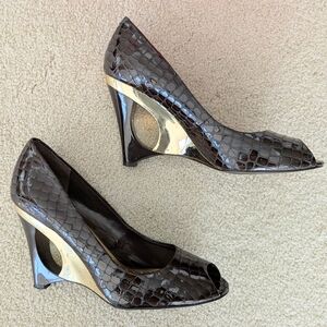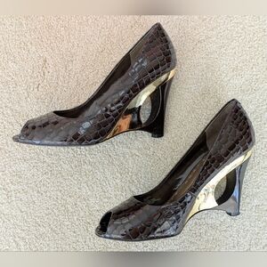 BCBGirls Brown Crocodile Patent Leather Decorative Gold Wedge Heel US Size 7