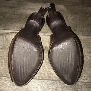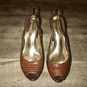 Excellent condition! Only worn once. Brown leather, Crocodile pattern peep toe. Gold at bottom w/ BCBG trim detailing. Sexy & Stylish!