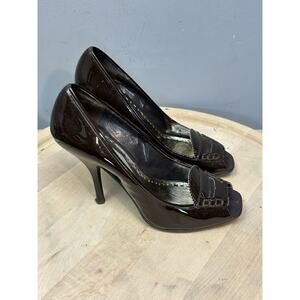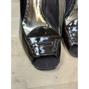 BCBGirls Brown Leather high heel shoes Sz 9.5B Style Is PL- HALLA Open Toe Shiny