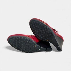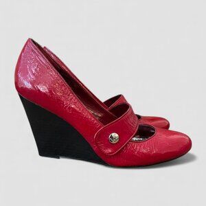 Boost your outfit with these stunning red crinkle patent leather heels by Bcbgirls. They feature an adorable wedge heel and a peep toe. Slip them on with ease. Perfect for adding a daring touch to any look. Pre-owned but in fantastic condition!