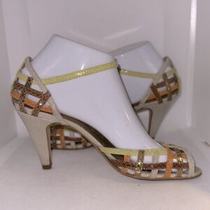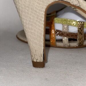 Beautiful metallic snakeskin strappy peep toe heels. Ankle strap with buckle closure. Leather upper with manmade lining and sole. Leather in perfect condition! Smoke free home.