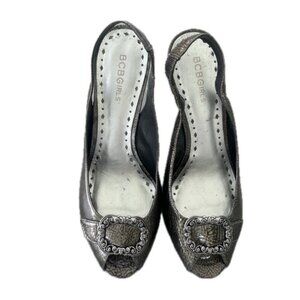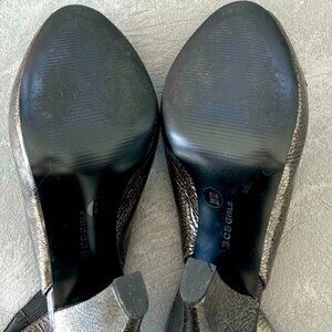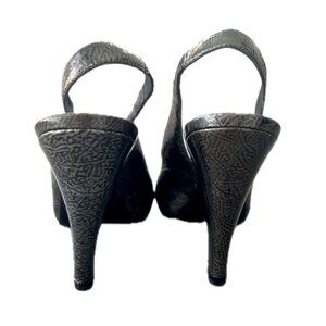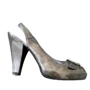 Adorable sling back peep toe heels. Textured pewter color has a slight green hue and a silver buckle. Chunky 4” heel makes these shoes easy to walk in! Only wear is on inner sole which isn’t visible while wearing. Like new exterior, no scratches or scuffs!