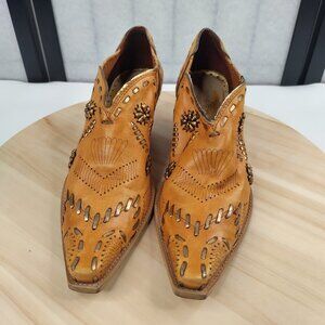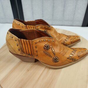 Beautiful western, pointed toe, fancy cowgirl booties with some bronze embellishments. Great for a rodeo, party, or a night out dancing with your friends. I haven't seen many of these beauties around recently, so this is a great find!!!