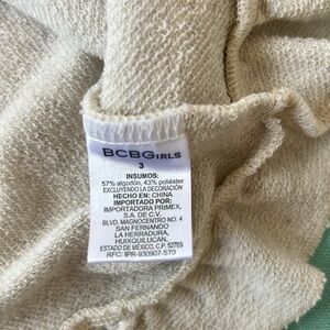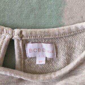 BCBGirls, Wish On A Star Follow Your Heart, Long Sleeve Graphic Shirt. Ruffle hemline detail. Cream with heathered grey though out with black and silver graphic. Wish On A Star Follow Your Heart front graphic. Plain back. Long sleeves with elastic cuffs. Key hole back, one button closure. Light weight sweatshirt knit, 57% cotton 43% polyester. Size 3T. See photos for measurements to ensure fit. Preowned condition. I also have this for sale in my closet in a 5T.