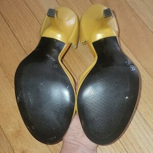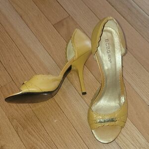 Make a bold statement in these BCBGirls yellow heels (size 8.5M)! Features scalloped trim, open toe, and vibrant color. Perfect for brunch, parties, or weddings. Lightly worn, still in great shape.
