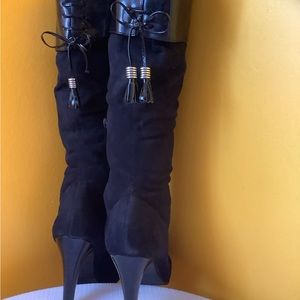 BCBGirls black synthetic with patent leather high heel tassel boots size 7.5