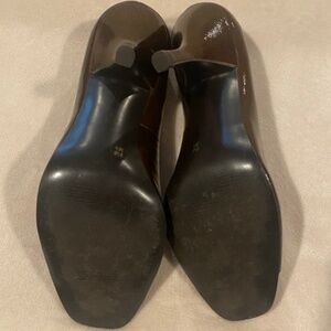 Classic brown patent leather open toe high heels (2-3 inch). Only worn a couple of times. Great for any summer or warm fall event.