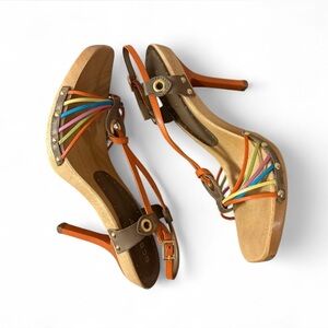 BCBGirls leather multi-coloured strappy square wood high heel sandals Sz 8
