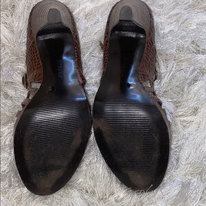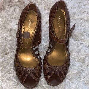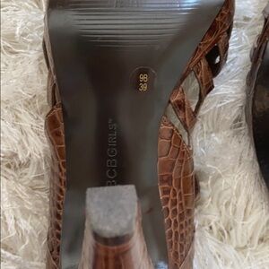 Used BCBG girls peep toe heels, a reptile brown leather like style, pretty much in good condition except for the inner part of the shoe as pictured, some peeling, also some scratching throughout the shoe some seen in the pictures not that significant. other than that shoes are intact super cute Mary Jane like style. Feel free to bundle with other items for better pricing.