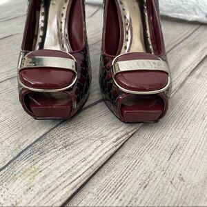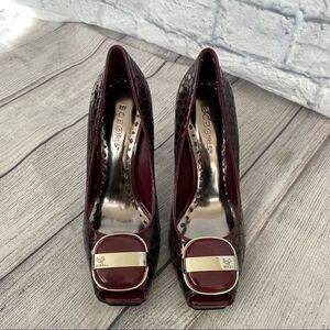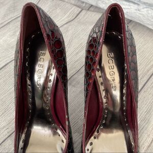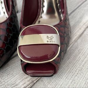 BCBGirls open toe grey and burgundy print high heel with logo on toe