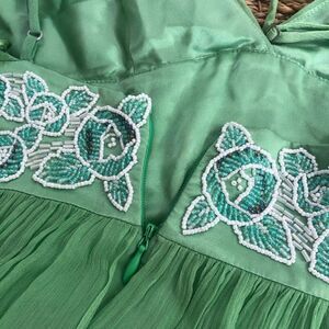 BCBG maxazria 100% silk green maxi dress with beautiful bead embroidery