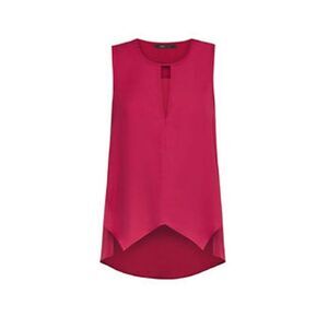 This satin-y tank features a keyhoel cutout at the neckline and a rounded high-low hem with slits at the sides. Pullover.