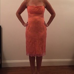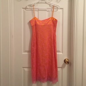BCBG Maxarzia Dress - Orange silk with Pink Lace Overlay. Size 2. Spaghetti straps (adjustable). Side zip.