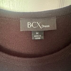 This BCX sweater dress features a striking black and red chevron pattern across the chest, complemented by a solid black lower half. Designed with a crew neck and long sleeves, it offers a comfortable fit perfect for casual or work settings. The knit material provides a soft and stretchy feel, making it an ideal choice for everyday wear.