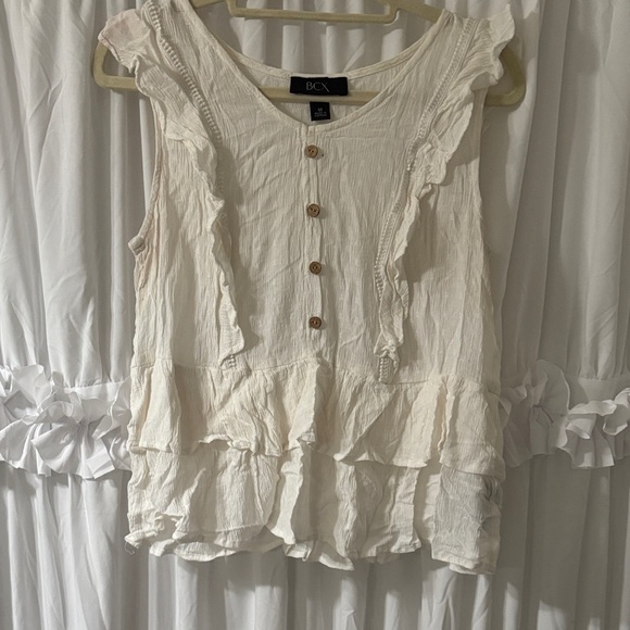 BCX sleeveless tank with delicate ruffle trim. Button-front placket with wooden-style buttons. Lightweight textured fabric with layered ruffle hem. Feminine and versatile for casual looks.