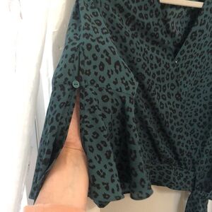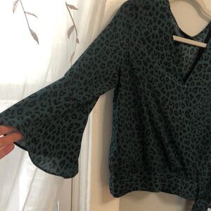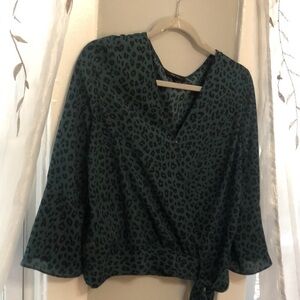 BCX Faux Wrap Emerald Dark Green Animal Print Bell Statement Sleeve Blouse Top L