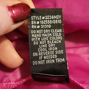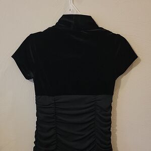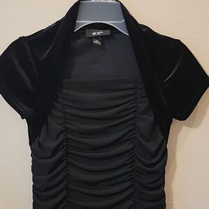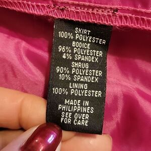 Built-in velvet shrug, ruched bodice to hip area, black lace overlay on fuchsia satin skirt. Excellent pre-owned condition.