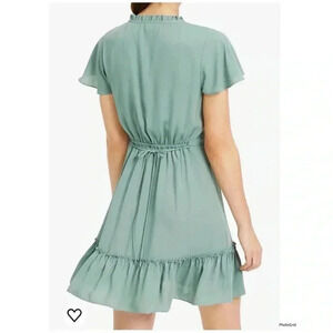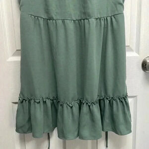 100% polyester ruffle green dress in size XL but in junior sizing (suitable for a women’s M).