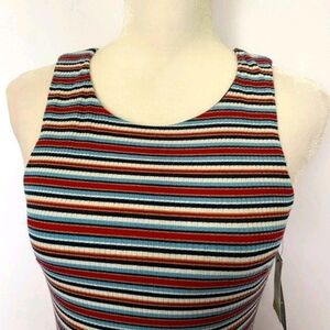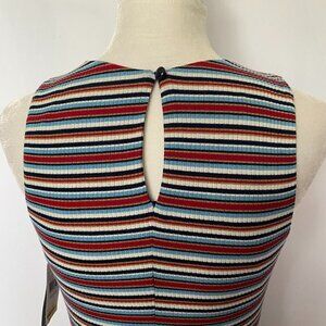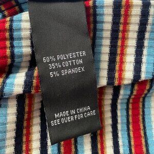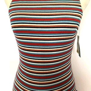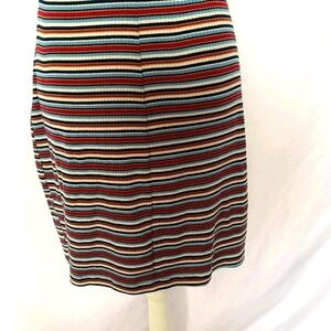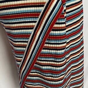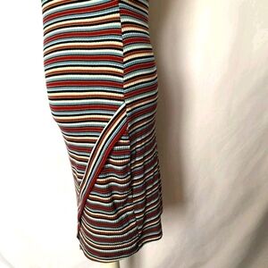 -Asymmetrical hem detail; multicolor horizontal stripe; ribbed fabrication