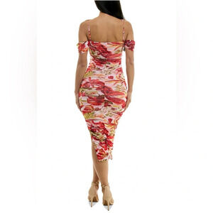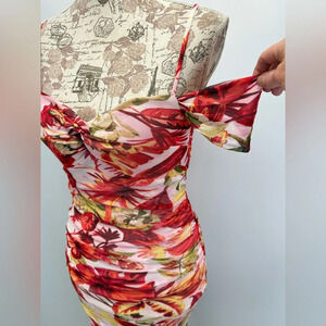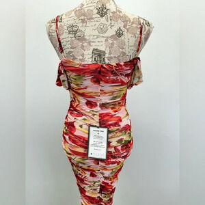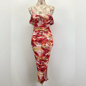 Red and pink floral ruched body con midi dress from BCX, size S. Dress has spaghetti straps and shoulder draping accent.